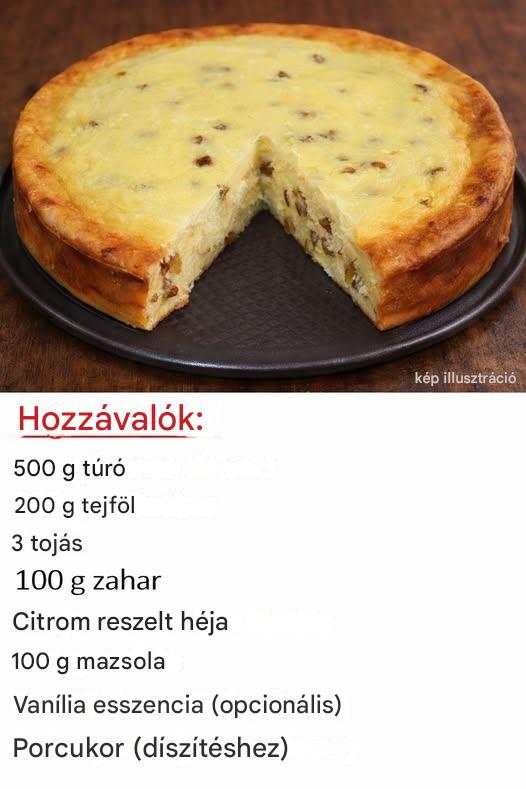 ADVERTENTIE 🧁 Egyszerű túrós sütemény mazsolával adminonMarch 27, 2026 ADVERTENTIE ADVERTENTIE 🛒 Hozzávalók 500 g túró 200 g tejföl 3 tojás 100 g cukor 1 citrom reszelt héja 100 g mazsola vanília aroma (opcionális) porcukor (a díszítéshez) 👩🍳 Elkészítés ADVERTENTIE következő »»ADVERTENTIE