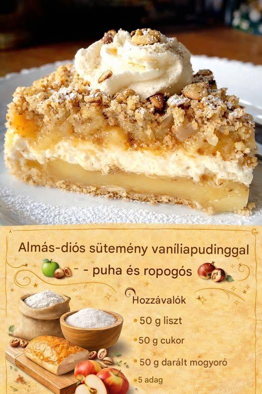 Ez a sütemény a textúrák találkozása: a ropogós dió, a szaftos alma és a selymes vaníliapuding együtt alkot egy olyan desszertet, ami után mindenki elkéri majd a receptet.