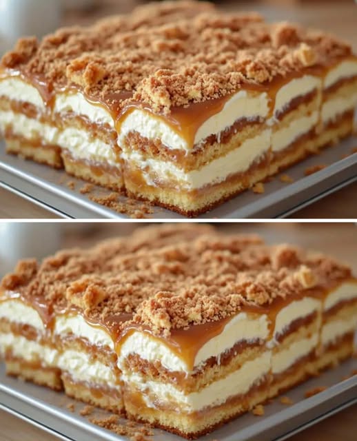 Egy krémes, sütés nélküli desszert, amely könnyen elkészíthető, és tökéletes a családi, édes pillanatokhoz. A vajas kekszrétegek közé finom mascarpone–tejszínhab krém kerül, a tetején pedig egy lágy karamellöntet, ami szó szerint elolvad a szájban. 🍰