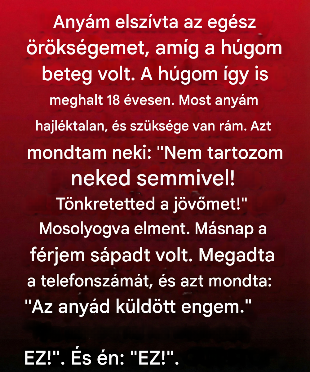 Másnap reggel Mara a konyhában találta a férjét, mozdulatlanul, elsápadt arccal. Szó nélkül átnyújtotta a telefonját. Egy üzenet érkezett az éjszaka folyamán egy ismeretlen számról. Az anyjától volt. Mellékelve egy fénykép: egy gondosan összehajtott dokumentum egy kis ezüst medál mellett, amelyet Mara azonnal felismert – egykor a húgáé volt. A kép alatt egy rövid üzenet állt: