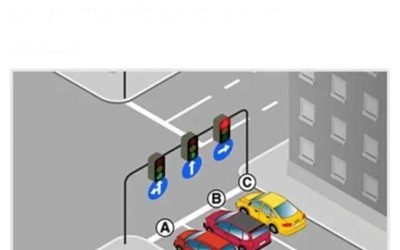 👉 Odpowiedź: ŻADEN samochód nie może skręcić w prawo. 🔍 Dlaczego? 🚦 1. Samochód C (żółty) Ma znak nakazu skrętu…