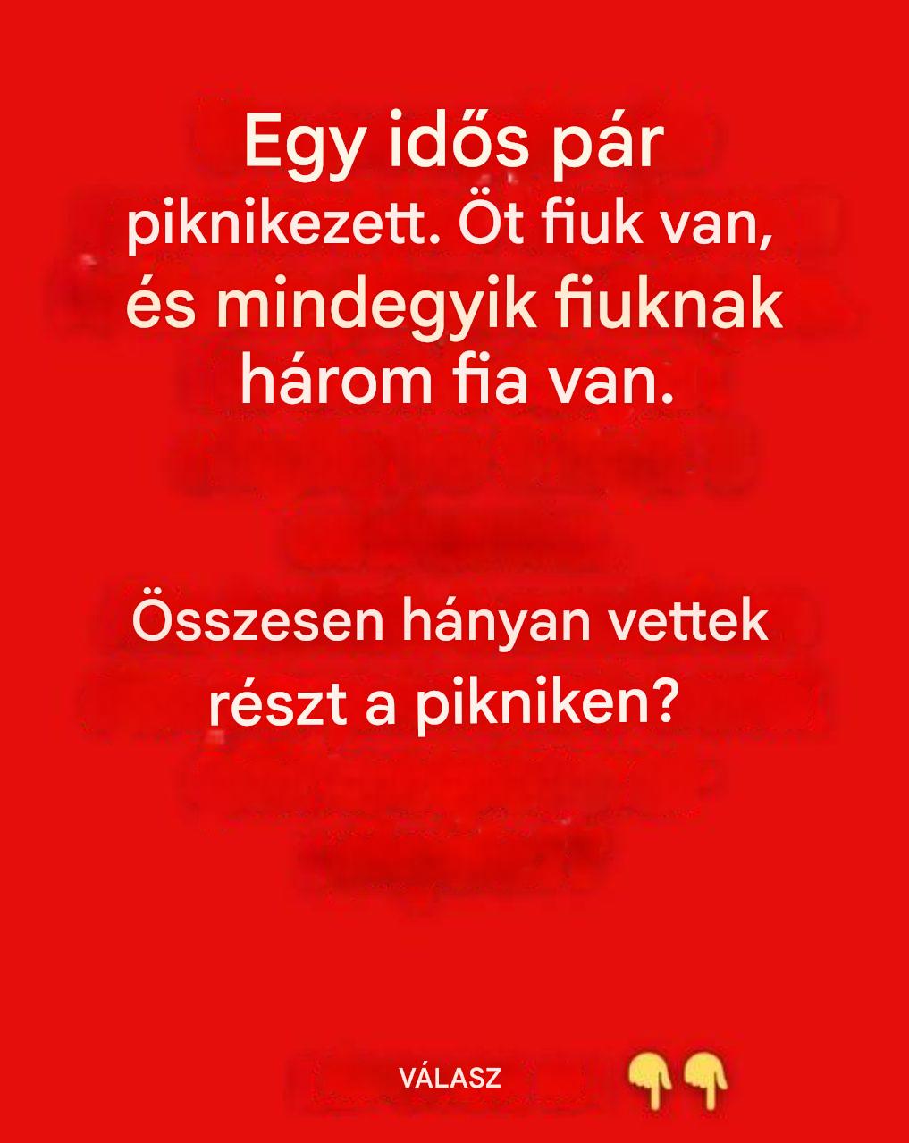 👉 „Egy idős házaspár piknikezett. Van 5 fiuk, és mindegyik fiúnak 3 gyereke van. Összesen hányan voltak a pikniken?”