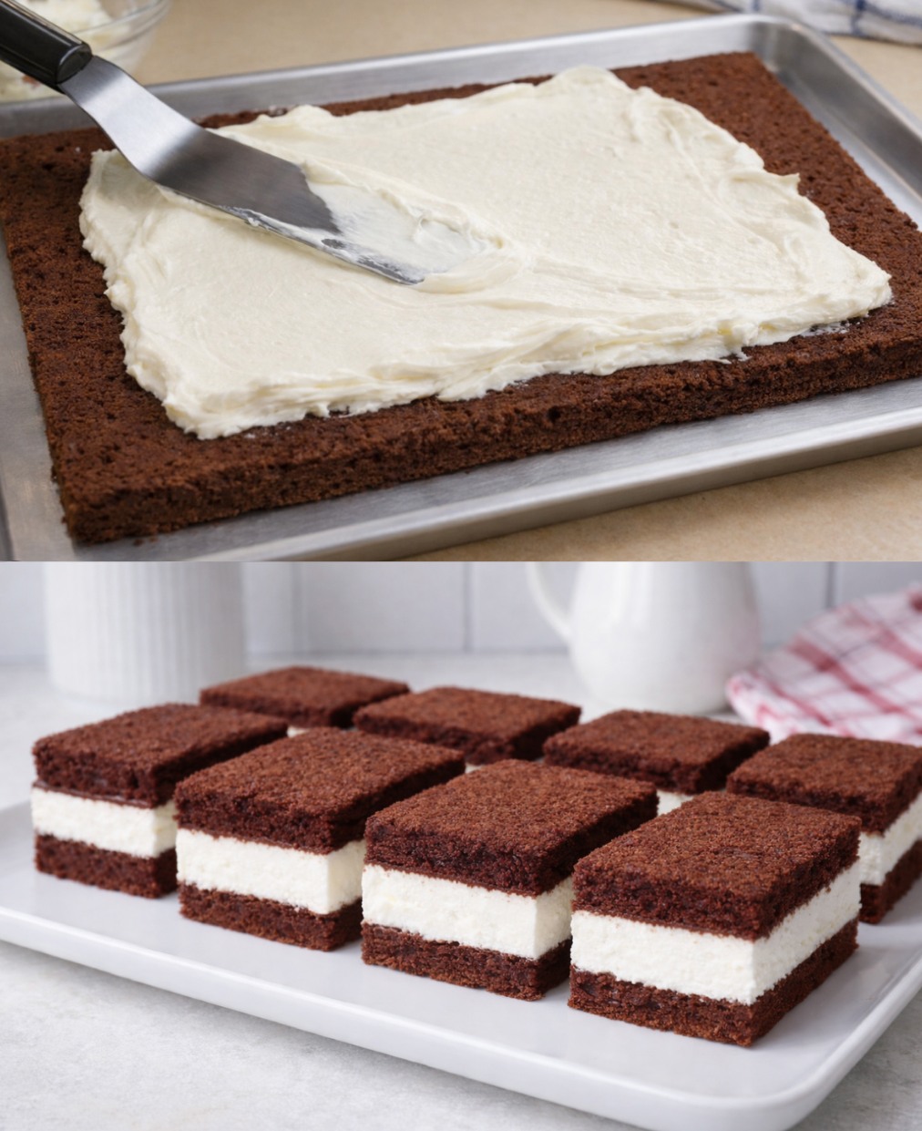 - Kend a krémet az egyik piskótalapra, simítsd el egyenletesen, majd helyezd rá a másik lapot.