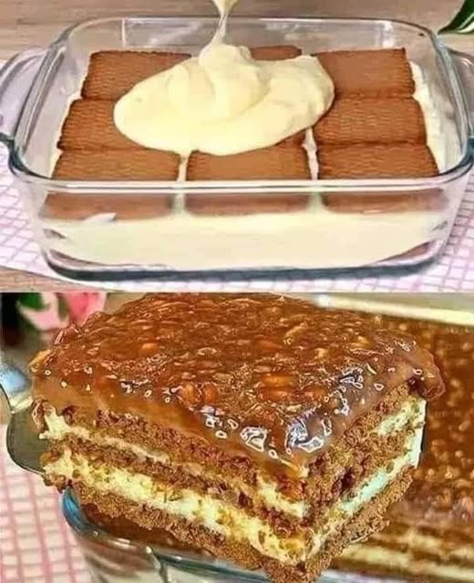 Ez egy szuper választás, mert minimális erőfeszítéssel kapsz egy látványos és krémes sütit. A kép alapján ez egy karamellás-pudingos kekszes szelet, amihez nem kell bekapcsolni a sütőt.