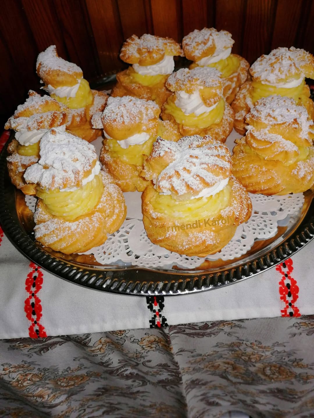 A tojássárgáját fele cukorral kikeverjük, hozzáadjuk a lisztet, a van cukrot és a pudingot majd a tej egy részével kikeverjük, a cukor másik felét hozzáadjuk a tejhez és felfözzük a krémnek valót, levesszük a tüzröl és a kemény habbá vert tojásfehérjét belekeverjük