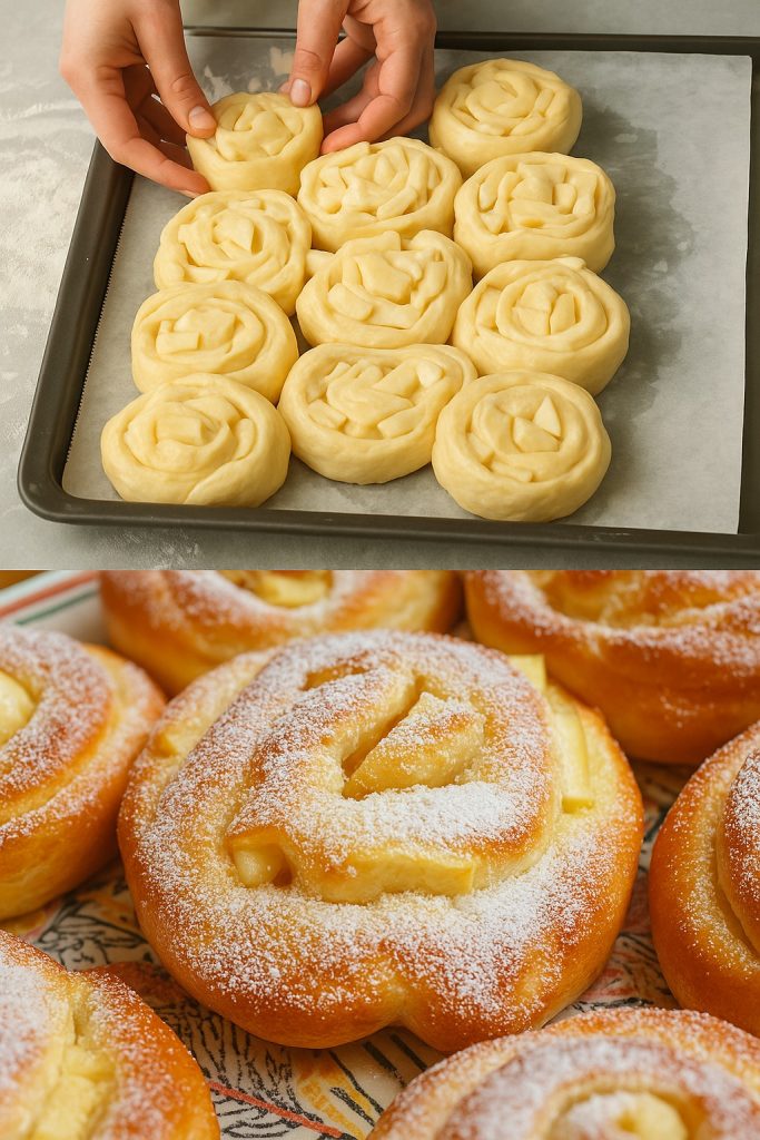 Puha, illatos, házi kelt tészta selymes vaníliakrémmel töltve, tetején porcukorral. Tökéletes reggelire vagy uzsonnára egy csésze tea vagy kávé mellé.